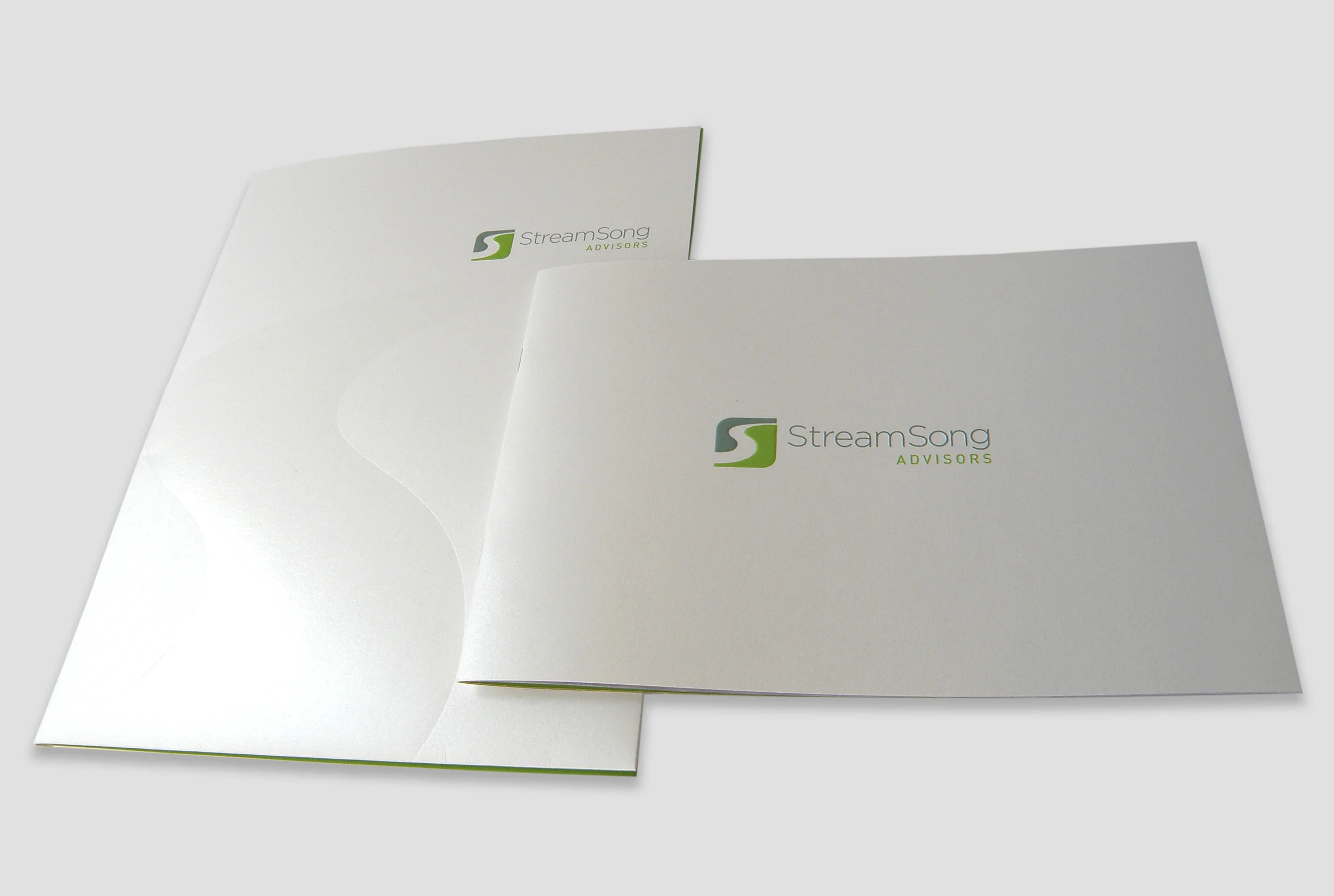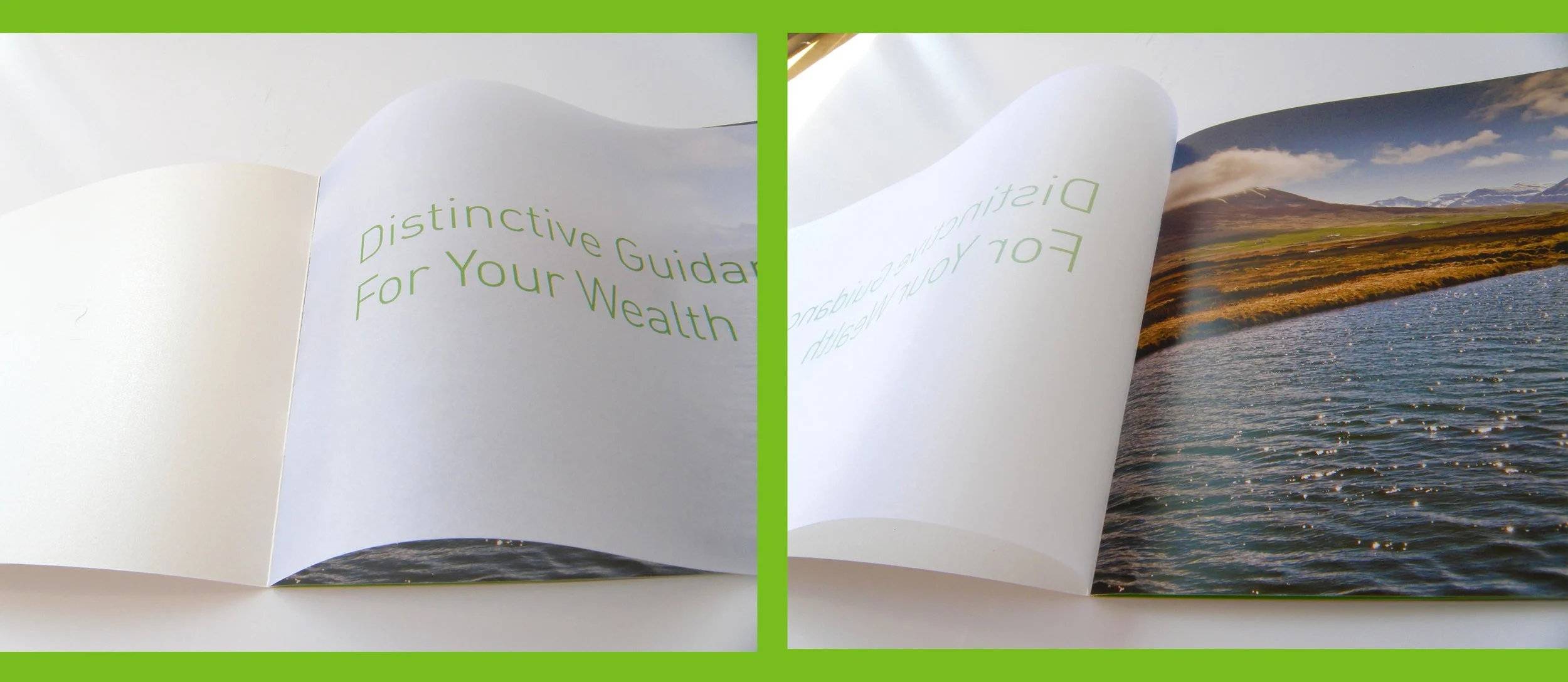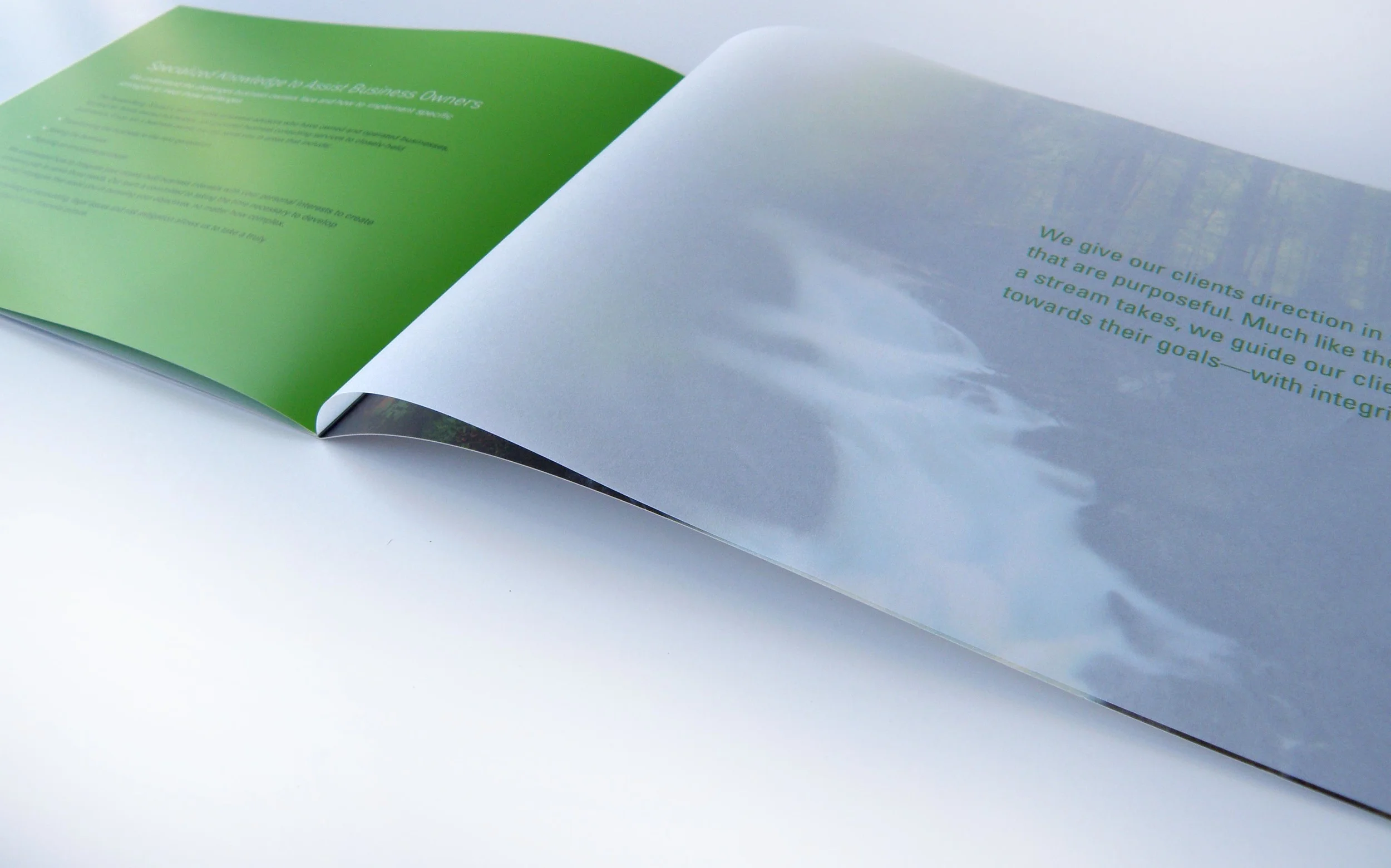 Peaceful nature photography captures the essence of this financial firm’s brand and philosophy emphasizing their transparent approach to financial guidance. Pearlized cover stock with embossed UV coating and velum overlay paper give an elegant look to complement the serene imagery and engage the high net-worth target market.