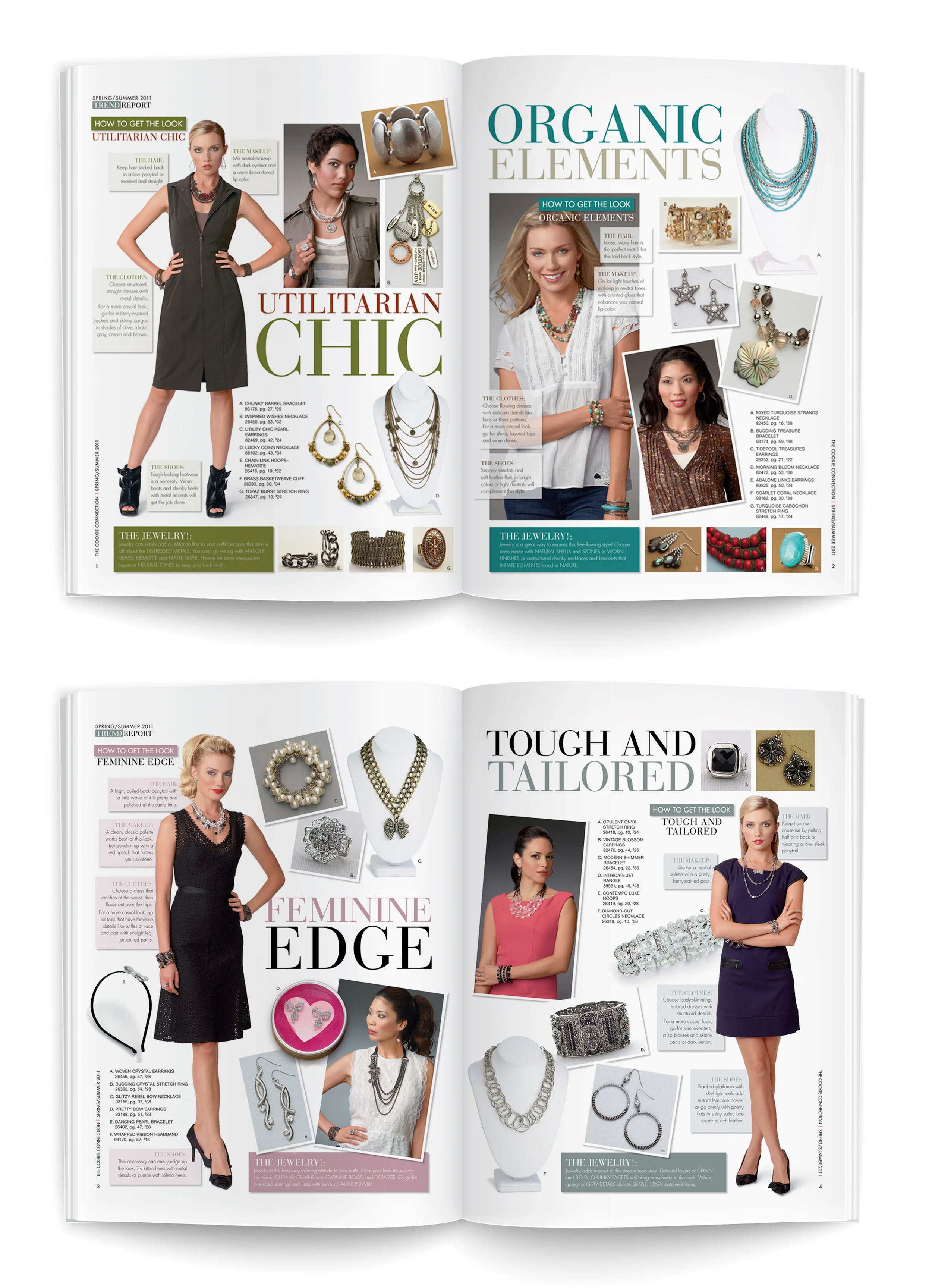 Sample spreads from a monthly fashion magazine for a direct sales jewelry company. Focus is directed towards jewelry consultants to stay on trend with seasonal products in order to better promote their business.